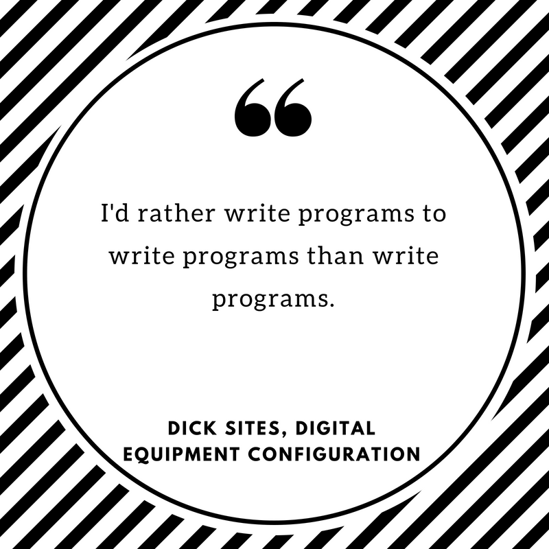 I’d rather write programs to write programs than write programs. – Dick Sites, Digital Equipment Configuration