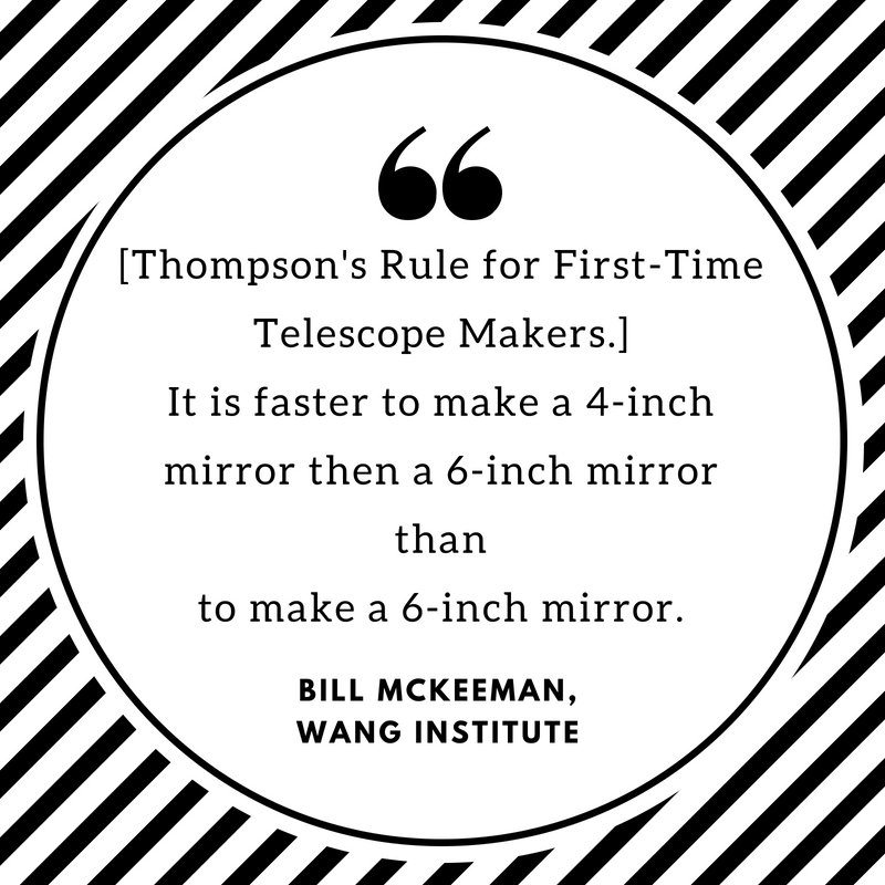 [Thompson’s Rule for First-Time Telescope Makers.] It is faster to make a 4-inch mirror then a 6-inch mirror than to make a 6-inch mirror. – Bill McKeeman, Wang Institute
