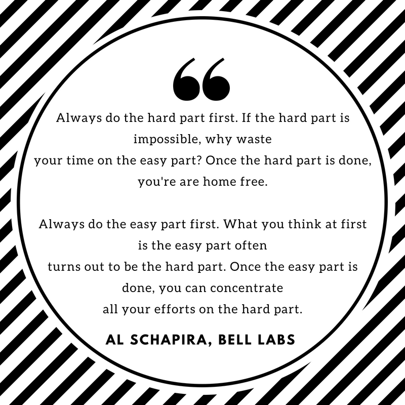 Always do the hard part first. If the hard part is impossible, why waste your time on the easy part? Once the hard part is done, you’re are home free. Always do the easy part first. What you think at first is the easy part often turns out to be the hard part. Once the easy part is done, you can concentrate all your efforts on the hard part. – Al Schapira, Bell Labs