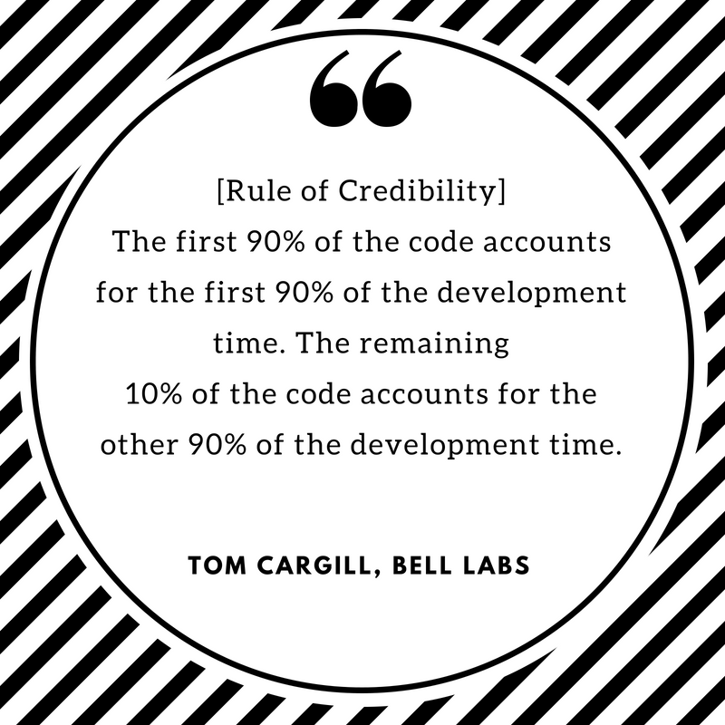 [Rule of Credibility] The first 90% of the code accounts for the first 90% of the development time. The remaining 10% of the code accounts for the other 90% of the development time. – Tom Cargill, Bell Labs