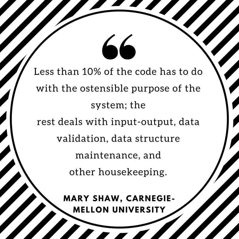 Less than 10% of the code has to do with the ostensible purpose of the system; the rest deals with input-output, data validation, data structure maintenance, and other housekeeping. – Mary Shaw, Carnegie-Mellon University