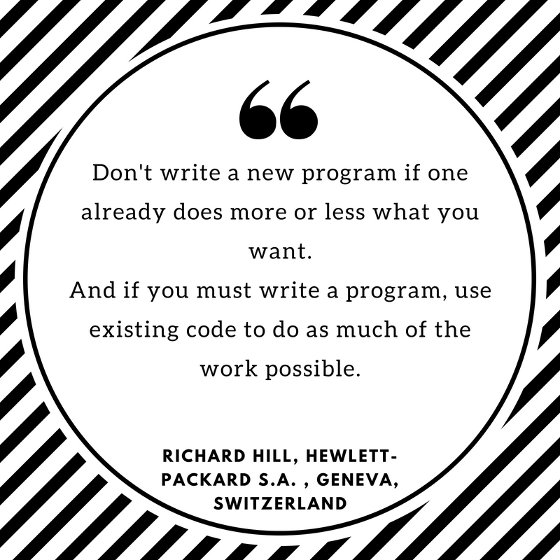 Don’t write a new program if one already does more or less what you want. And if you must write a program, use existing code to do as much of the work possible. – Richard Hill, Hewlett-Packard S.A. , Geneva, Switzerland