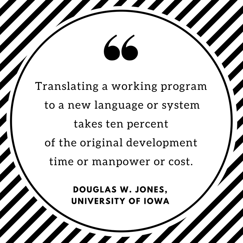 Translating a working program to a new language or system takes ten percent of the original development time or manpower or cost. – Douglas W. Jones, University of Iowa
