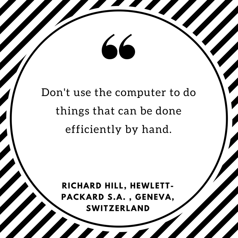 Don’t use the computer to do things that can be done efficiently by hand. – Richard Hill, Hewlett-Packard S.A. , Geneva, Switzerland