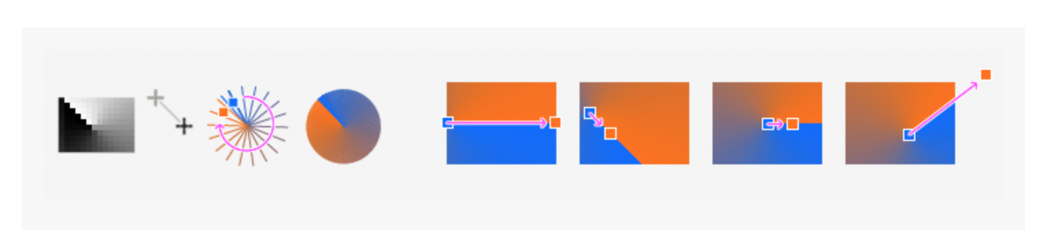 These gradients are called “conic” or “conical” because, if the color stops are chosen to be significantly lighter on one side than the other, it produces a pattern that looks like a cone observed from above. They are also known as “angle” gradients in some contexts, since they are produced by varying the rotation angle of a ray.