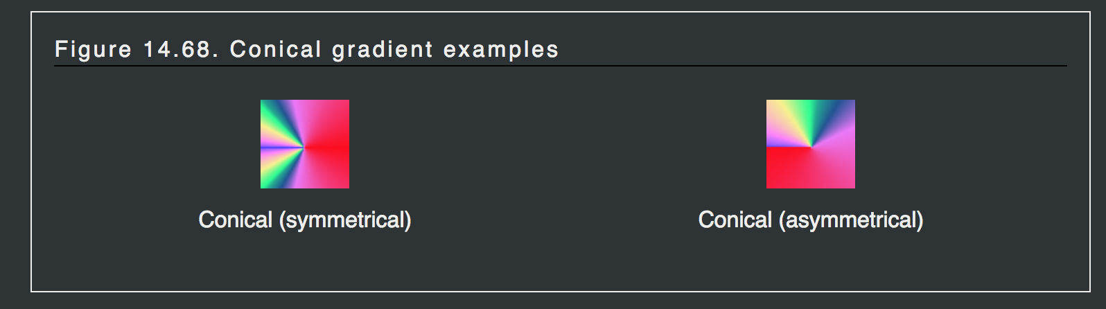 A conic gradient is specified by indicating a rotation angle, the center of the gradient, and then specifying a list of color-stops. Unlike linear and radial gradients, whose color-stops are placed by specifying a length, the color-stops of a conic gradient are specified with an angle. Rays are then drawn emerging from the center and pointing in all directions, with the color of each ray equal to the color of the gradient-line where they intersect it.